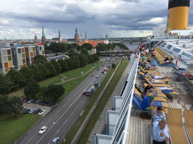 Am nächsten Tag ging es zum meiner Meinung nach coolsten Liegeplatz der gesamten Reise. Nach dem man mal wieder durch das thrustergesteuerte Anlegemanöver geweckt worden war, konnte man , zunächst per TV, feststellen, dass das Schiff quasi mitten in der Stadt parkte, direkt neben einer mehrspurigen Straße und auch nur unweit der Altstadt.