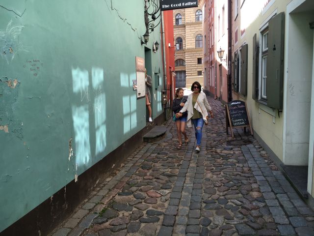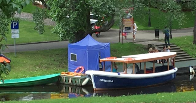 Dann gab es noch eine kurze individuelle Runde, um wie üblich Ansichtskarten und Kühlschrankmagneten zu besorgen. Das bis dahin der Wettervorhersage widersprechende Wetter versuchte es noch rauszureißen indem es den abschließenden Spaziergang am Daugava-Ufer mal so richtig ins Wasser fallen ließ. Das führte dazu, dass nach einem längeren Aufenthalt unter einer Brücke auch noch die städtischen Grünanlagen zertrampelt wurden, da die Bäume dort zumindest einen geringen Schutz vor dem Regen boten.
