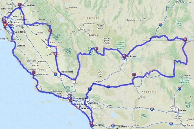 Als erstes mal die (ungefähr) von uns gefahrene Route. Die ursprüngliche Planung waren ca. 2200 Meilen, die hier abgebildete Route hat knapp 2500 Meilen. Gefahren sind wir letzlich etwas über 3000 Meilen, haben dafür fast 73 Stunden gebraucht und dabei 125 Gallonen Benzin in Kohlenmonoxid und andere schöne Sachen umgewandelt...
